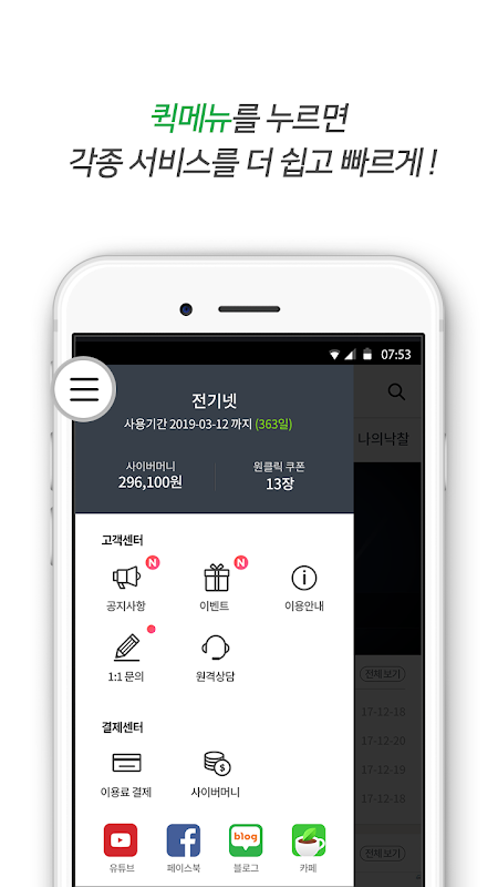 تھری لائن مینو (三) کے ذریعے ، آپ کسٹمر سنٹر ، ادائیگی مرکز ، ایپ کی ترتیبات اور لاگ آؤٹ جیسی خدمات کو ایک جگہ استعمال کرسکتے ہیں۔