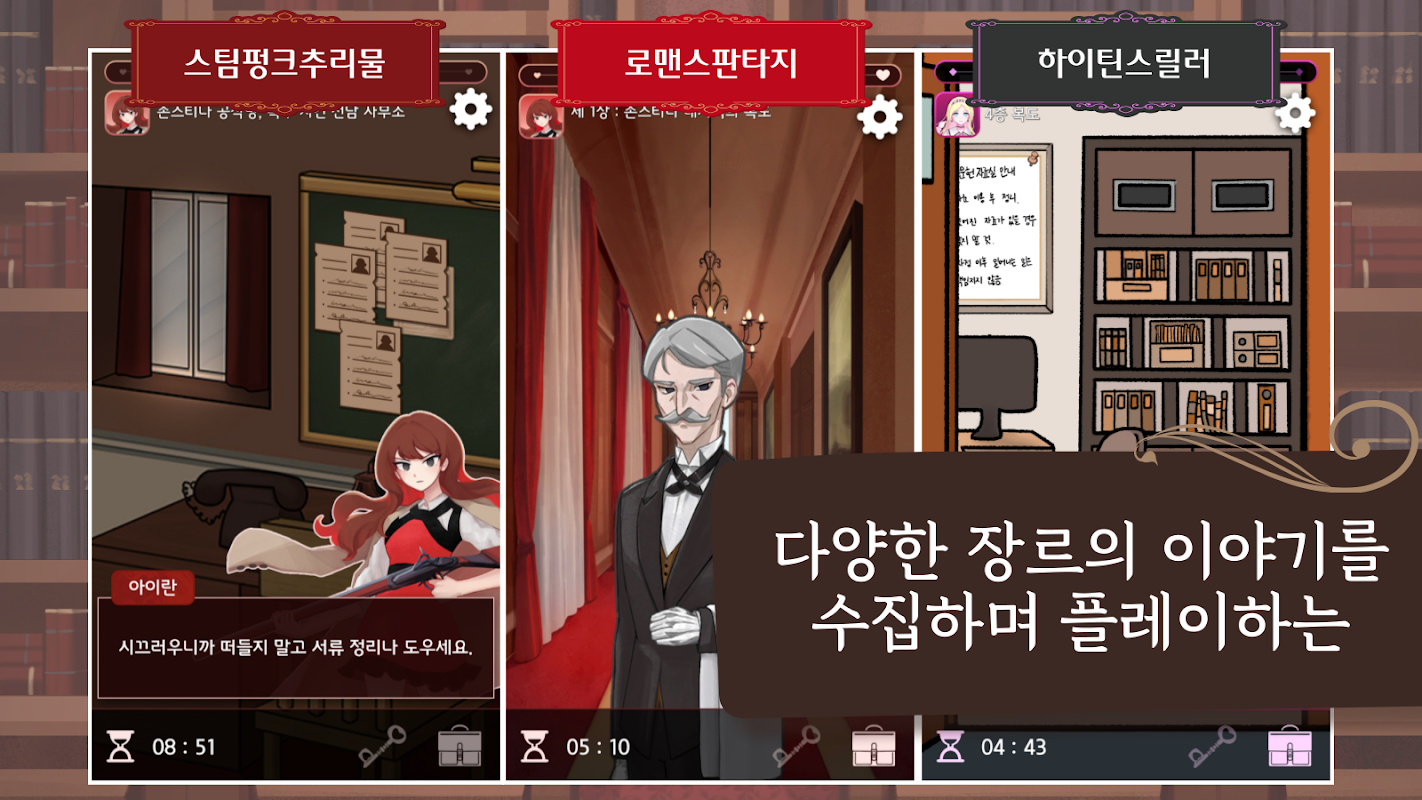 جب آپ تمام بکھرے ہوئے کہانی کے ٹکڑوں کو اکٹھا کرتے ہیں اور ایک کہانی مکمل کرتے ہیں تو کہانی ’میری لائبریری‘ میں داخل ہوتی ہے۔ 챕터를 하나씩 클리어하고, 챕터가 모이면 책을 한 권씩 모으면서 내 서재를 꾸며나갈 수 있습니다.