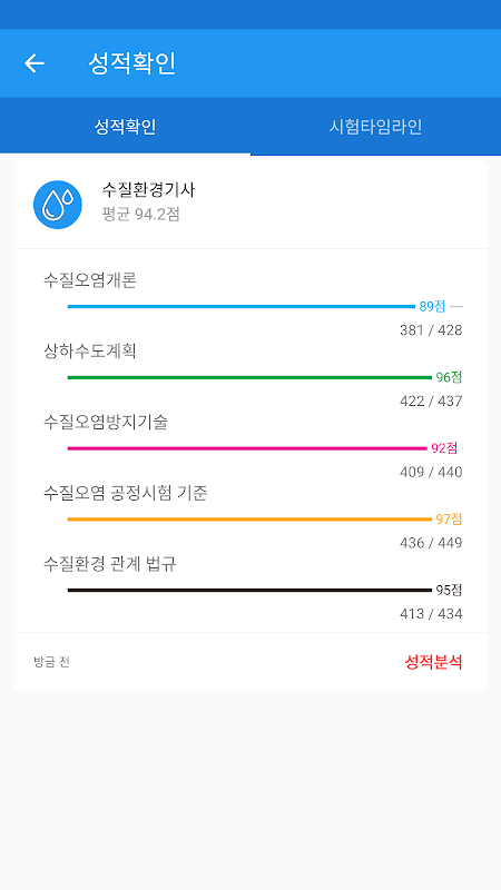 성적확인 - 각 과목별 성적 및 그동안 풀어본 기출문제와 모의고사, 문제풀기의 성적을 볼 수 있습니다.