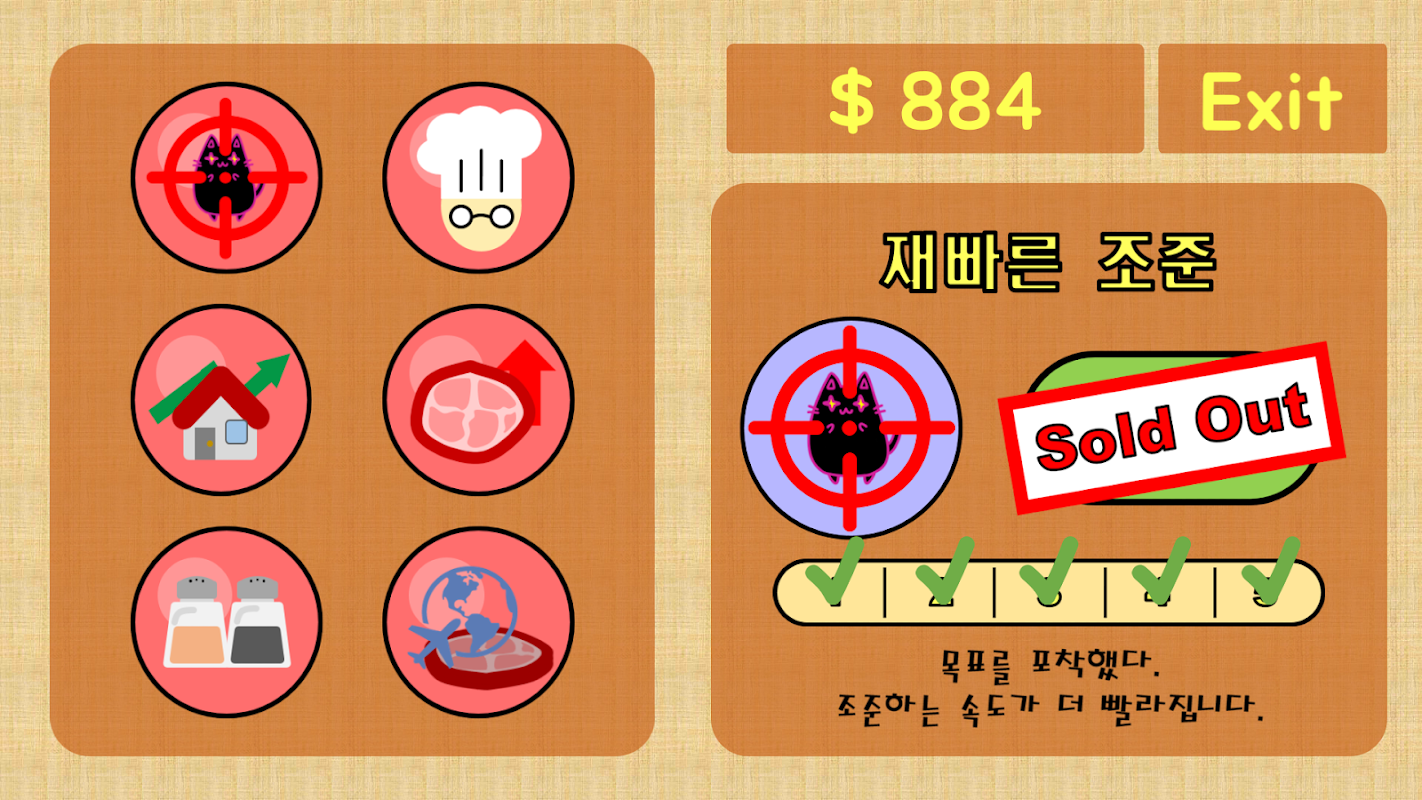 알맞지 않은 고기를 주면 먹지 않아요. 적절한 고기를 주면 고양이는 행복해지고 당신은 돈을 벌 수 있어요.