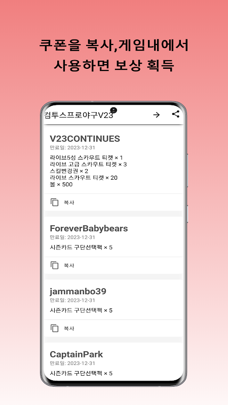 کوپن کی میعاد ختم ہونے سے پہلے اسے استعمال کریں۔ آپ "Com2uS Professional Baseball V24" کے لیے کوپن کی معلومات ڈسپلے کر سکتے ہیں اور نئے کوپن جاری ہونے پر پش نوٹیفیکیشن حاصل کر سکتے ہیں۔