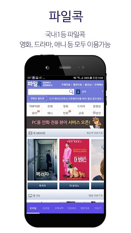 모바일로 최신영화, 드라마, 동영상, 애니 만화 등의 컨텐츠를