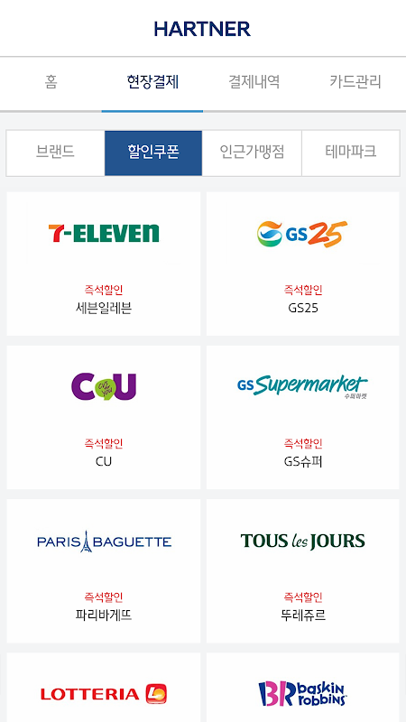 하트너에 등록된 CU, 세븐일레븐, GS25, 파리바게뜨, 뚜레주르 등의