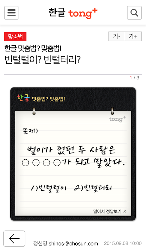 헷갈리는 한글 맞춤법을 퀴즈 카드로 풀어 한 눈에 쏙쏙 이해 됩니다.
