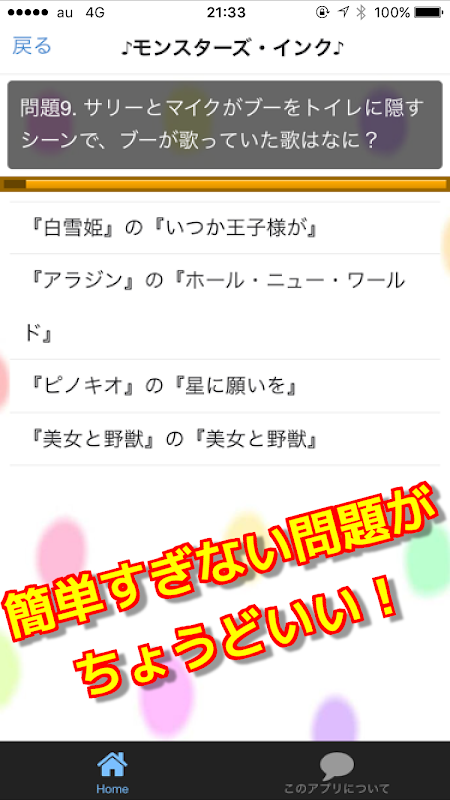 このアプリは、ディズニーの仲間たちやディズニー映画に関する内容をクイズにしたものです。