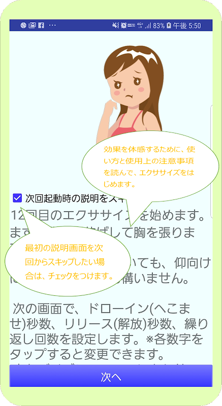 アプリを起動すると、説明画面が表示されます。[次へ]ボタンをタップして、エクササイズ画面を表示します。