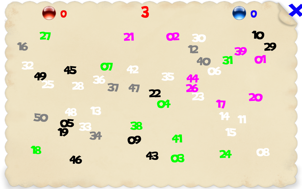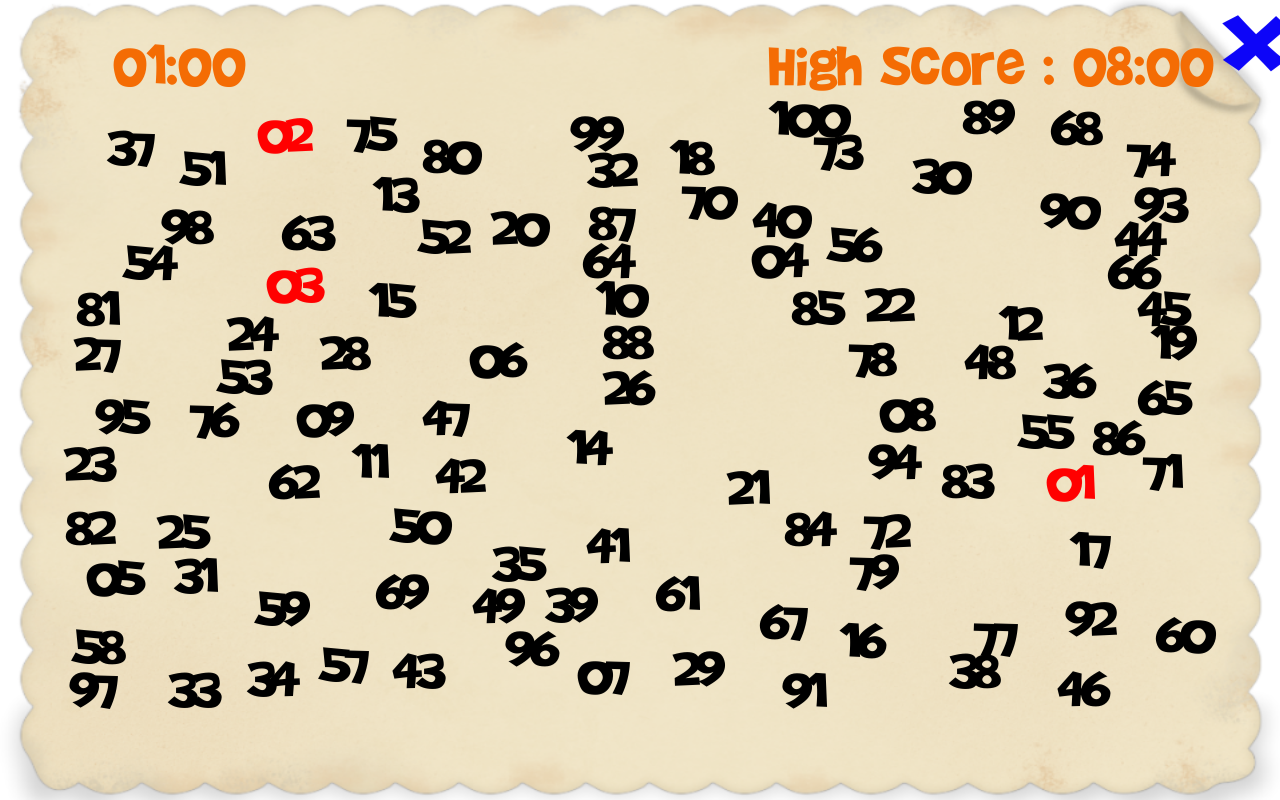 In game you must use your eyes and hand as quick as you can to find all numbers from 1 to 50 or 100 or 150. Have 2 mode for your choice : single or VS (play with your friend):