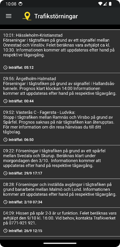 سویڈن میں ٹرین ٹریفک سے متعلق اصل وقت کی معلومات۔ ٹریفک کی خرابی ، تاخیر کے اسباب اور جہاں ٹرینیں واقع ہیں دیکھیں۔