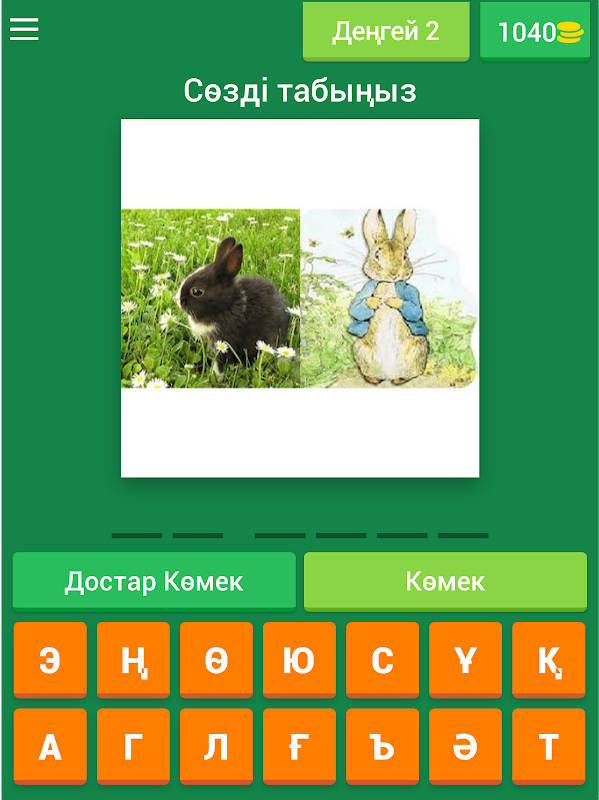 • Ойынның әрбір деңгейінде 2 сурет немесе 2 сурет бар. Екі суретте де кең таралған сөздер бар. Екі суретте ұсынылған сөзді қалыптастыру үшін берілген әріптерден әріптерді таңдаңыз