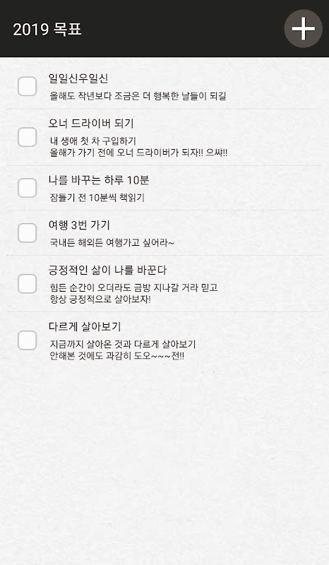 - 각 화면에서 [+] 버튼을 눌러서, 새로운 내용들을 추가하세요.