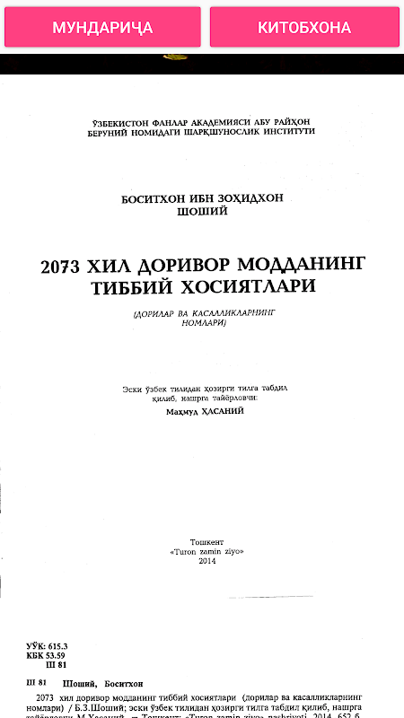 2073 хил доривор модцанинг тиббий хосиятлари (дорилар ва касалликларнинг номлари) / Б.З.Шоший; эски ўзбек тилидан ҳозирги тилга табдил қилиб, нашрга тайёрловчи М.Ҳасаний — Тошкент: «Turon zamin ziуо» nashriyoti, 2014, 652 б.