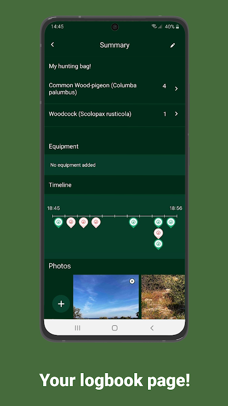 سیشن کے اختتام پر، آپ کے پاس لاگ بک کا ایک مکمل صفحہ ہوتا ہے، جس میں کل وقت، فاصلہ، شکار کی اقسام، تصاویر اور دیگر متعلقہ معلومات ہوتی ہیں۔