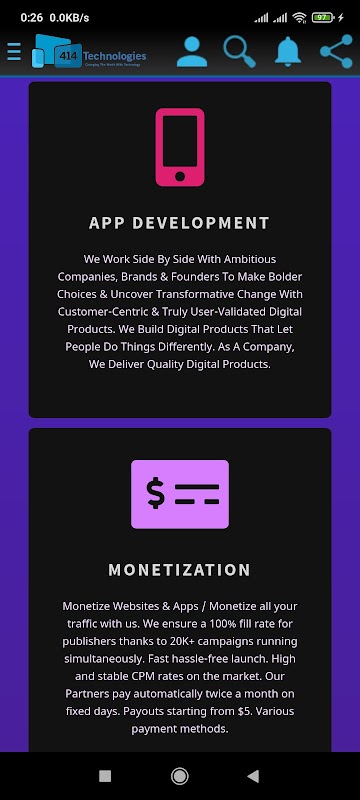 414 ٹیکنالوجیز نے عام طور پر ریاستہائے متحدہ امریکہ، برطانیہ، کینیڈا، جنوبی افریقہ، فرانس، آسٹریلیا، نیوزی لینڈ، جرمنی، سنگاپور اور کشمیر کے کلائنٹس کے لیے 1K+ سے زیادہ ویب سائٹ ڈویلپمنٹ پروجیکٹس پر پیشہ ورانہ خدمات فراہم کیں۔ کاروباری ڈومینز، صنعتوں، برانڈز اور کمپنیوں کے وسیع میدان میں ویب سائٹس اور ایپس کی تعداد کو ڈیزائن کرنا، تیار کرنا اور منیٹائز کرنا۔