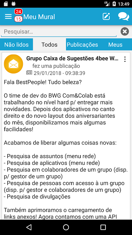 Um composto de práticas e tecnologias que possibilita às pessoas trabalharem de forma colaborativa e integrada através da plataforma, independentemente do posicionamento hierárquico. Troque conhecimentos entre todos ou com pessoas específicas, receba feedbacks em real time das suas publicações, mapeie as expertises para criar seu grupo de projeto e/ou de departamentos, e o melhor, tudo isso com um controle administrativo de permissões. O 4bee Work está disponível para todos tipos de dispositivos, podendo gerenciar e exercer todas as atividades da sua organização de qualquer lugar, a hora que for preciso.