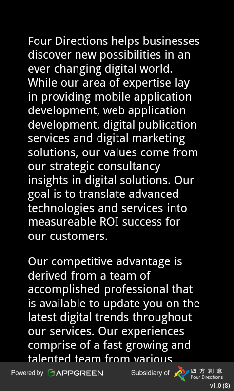 Four Directions helps businesses discover new possibilities in an ever changing digital world. While our area of expertise lay in providing mobile application development, web application development, digital publication services and digital marketing solutions, our values come from our strategic consultancy insights in digital solutions. Our goal is to translate advanced technologies and services into measurable ROI success for our customers.