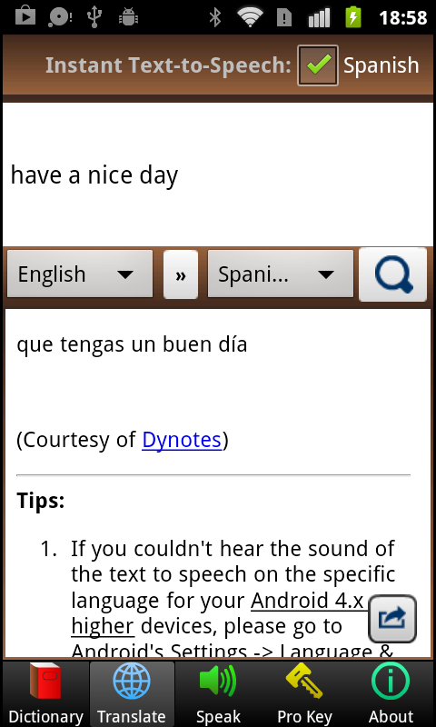 This free Multiple Language Dictionary + Translate and Instant Speak (Text to Speech) with clear voices is a unique dictionary and translator app in the Google Play, supporting including English, Arabic, Spanish, French, Chinese, German, Italian, Japanese, Korean, Dutch, Polish, Portuguese, Russian and much more!