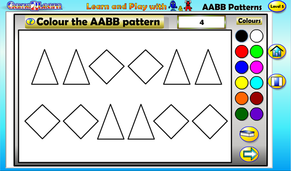 AABB patterns with Q&A includes a number of gamification elements designed to challenge children and engage them in the learning experience. These elements combined with the open navigation and non-threatening learning environment foster a child's confidence, understanding and independent learning skills.