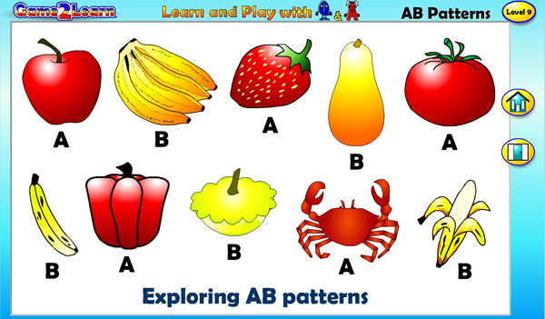 3. A bonus game either 'just for fun' or designed to reinforce patterning concepts. (These include making, colouring and drawing AB Patterns.)