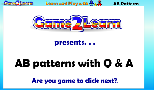 AB patterns with Q&A is has 12 levels of increasing difficulty. Each level includes: