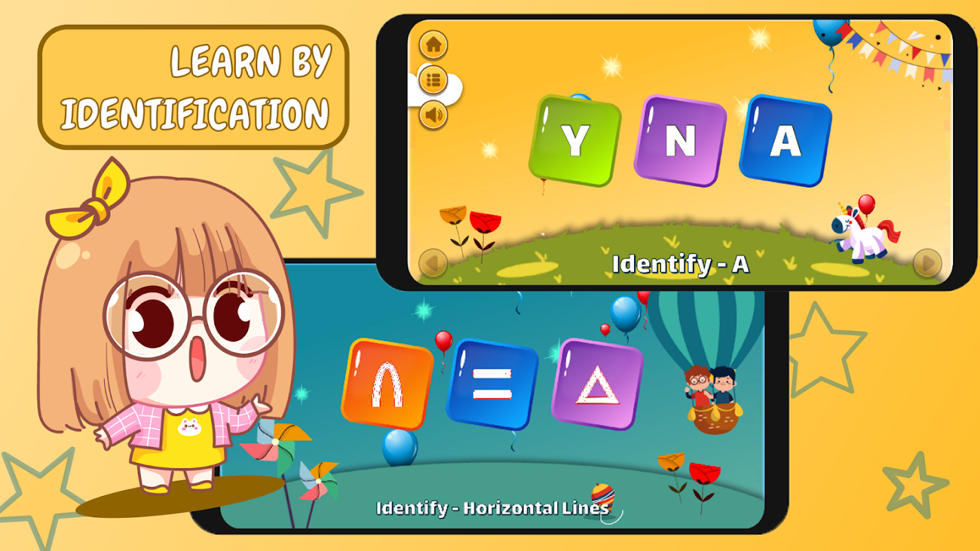 ٹریسنگ اور شناخت کرکے انگریزی حروف تہجی، نمبر، لائنز اور شکلیں سیکھیں۔