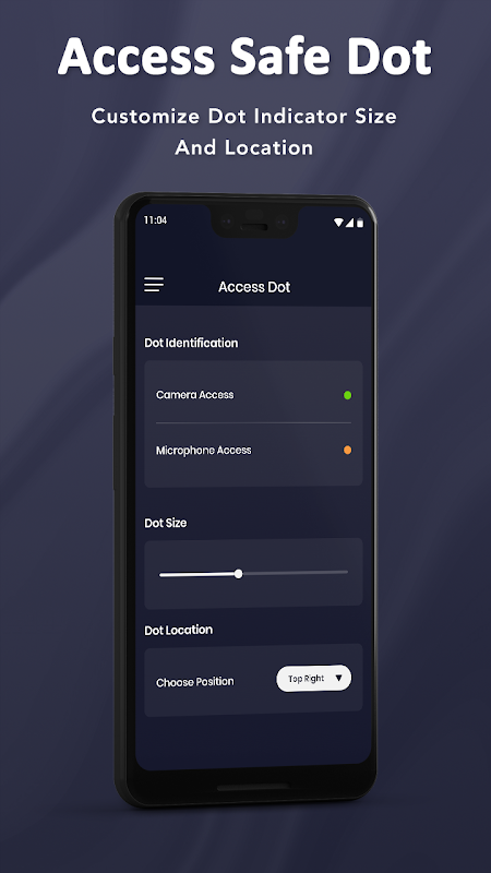 ایپ کو تشکیل دینا اتنا ہی آسان ہے جتنا کہ رسائی ڈاٹس کی رسائسی سروس (ایپ میں ٹوگل سوئچ> (مزید) ڈاؤن لوڈ کی خدمات / انسٹال کردہ سروسز> ایکسیس ڈاٹ> ایبل) کو قابل بنانا۔ پہلے سے طے شدہ طور پر ایپ کو iOS 14 طرز کے رنگین رسائی کے نقطوں کو دکھانے کے ل config تشکیل دیا گیا ہے - کیمرے تک رسائی کے لئے سبز ، مائکروفون تک رسائی کے لئے اورینج۔ ایپ خود کیمرہ یا مائکروفون تک رسائی کی درخواست نہیں کرتی ہے۔