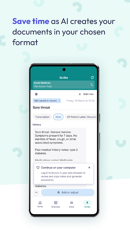 • Accurx اسکرائب: اس AI سے چلنے والے اسکرائب کے ساتھ ٹائپنگ کو چھوڑ کر وقت کی بچت کریں جو آپ کے مریضوں کے تمام تعاملات کو نقل کرتا ہے، بات چیت سے فوری طور پر ساختی نوٹ تیار کرتا ہے اور سیکنڈوں میں آپ کے خطوط اور دیگر آگے کی دستاویزات تیار کر سکتا ہے۔ یہ سب کچھ محفوظ ہے، آپ کے کمپیوٹر سے جائزہ لینے کے لیے تیار ہے۔