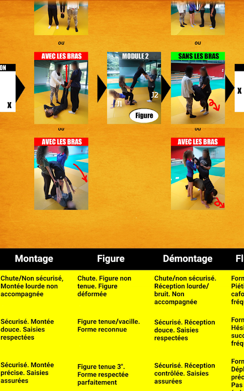"4 یا 5 تک ، جمناسٹک کوریوگراف تحریر کرکے انجام دیں جو 3 مسلط جامد اعداد و شمار ، 4 تشکیلوں اور متصل عناصر پر مشتمل ہیں جو اسمبلی کے دوران اعداد و شمار اور استحکام کو یقینی بناتے ہیں۔ 3 میں سے 2 کردار: پورٹر ، ایکروبیٹ یا جوکر (اسپاٹر ، مدد یا چوکس)۔ ججوں کی خدمات اور ان کی تعریف کریں۔ "