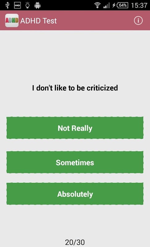 Disclaimer: made for educational purposes in order to raise awareness of common ADD symptoms. ADD and ADHD are serious conditions and no mobile or online test can give a realistic diagnosis. If you suspect that you suffer from this condition please talk to a professional.