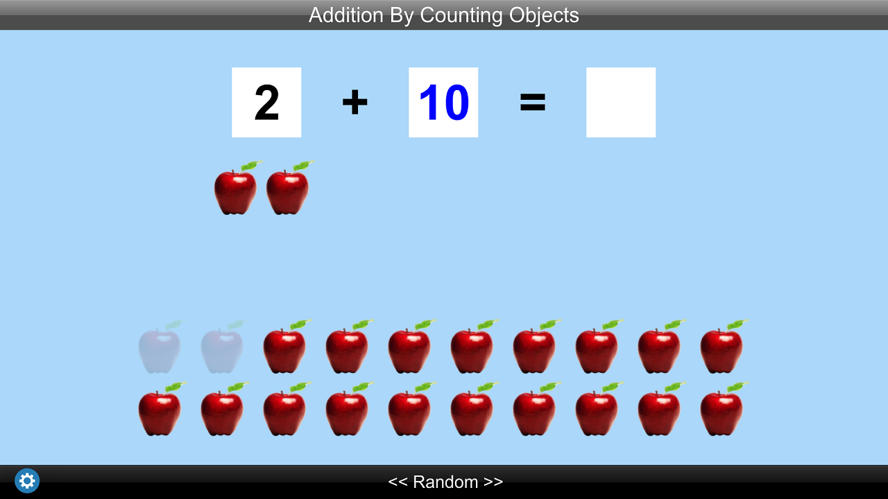 In this app addition is illustrated by adding numbers of objects. If, for instance, the addition problem (which appears at the top of the screen) is 9 + 7 = ?, the student will be told to click on the blinking number 9. Nine apples will rise from the group at the bottom of the screen to the space under the 9. Now the second number (7) will be blinking and the student will be told to click on the blinking number. Seven apples will rise to the space under the 7. Now the student will be told to click on each of the apples under the numbers. The apples will be blinking in succession, and the student should click on each apple as it blinks. When the student clicks on the apple it gets a number and changes its color. When the student gets to the last apple (apple number 16 for this problem), the program voice tells the student to click the last apple again. The program voice states “Nine plus seven is sixteen” and 16 appears in the answer space. This program adds only single-digit numbers.