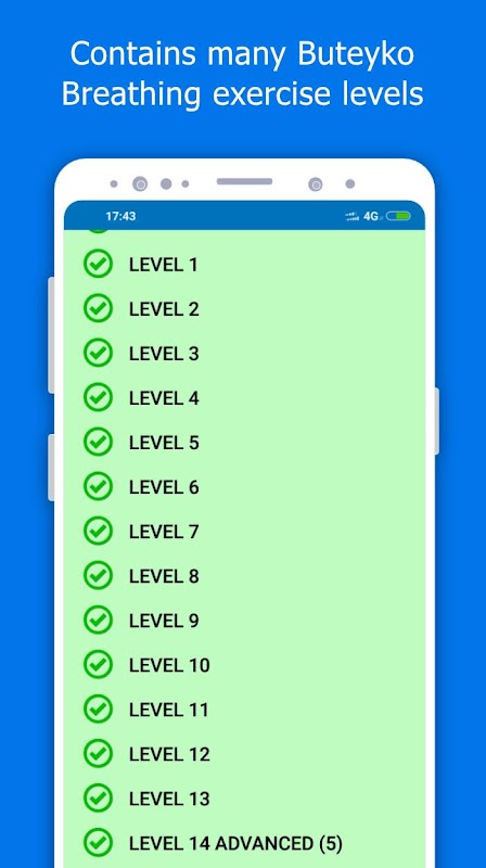 ایپ کا پہلا درجہ فوری طور پر کیا جاسکتا ہے۔ سطح کے قابل بنائے جانے کے لئے مفت صارف اکاؤنٹ کے لئے سائن اپ کریں۔ Buteyko سانس لینے کے مکمل کورس کے لئے ہر سطح (www.advancedbuteyko.com) پر سائن اپ کریں۔