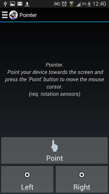 If your device has rotation sensors, Advanced Windows Remote can also be used as a laser pointer, converting your device's motion to mouse cursor movement on the computer display. This works very much like the Wii remote and is very useful for presentations.