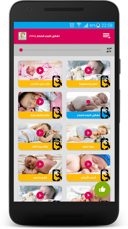 من خصائص تطبيق تهاليل النوم للصغار أنه يشمل الكثير من المقاطع و الأناشيد و التهاليل للصغار ،كما يمكن اضافة الأناشيد للمفضلة و اختيارها كرنة و نغمة الهاتف .