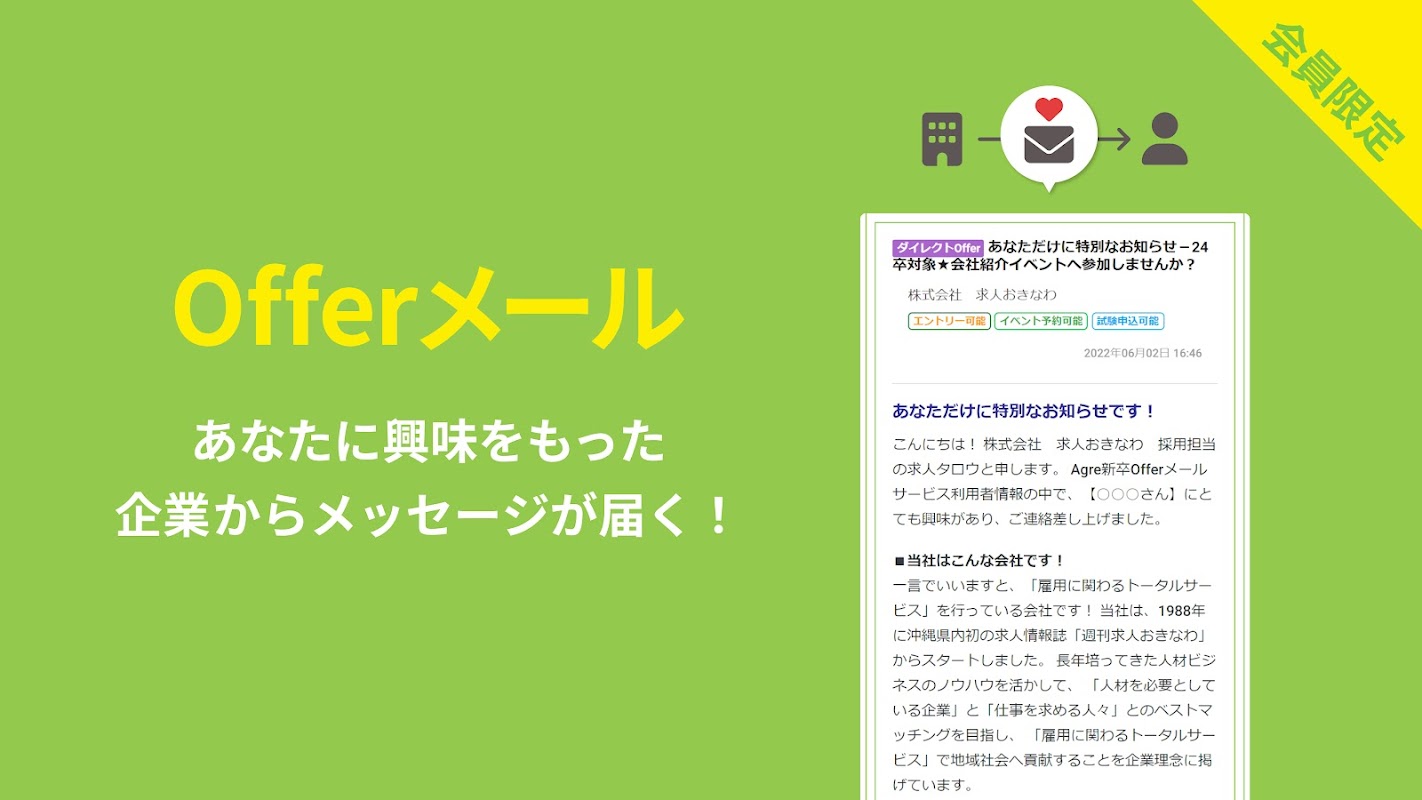 جاب آفر اوکیناوا کے ذریعہ فراہم کردہ "Agre New Graduate" جو کہ Agre کو شائع کرتی ہے، نئے گریجویٹ طلباء اور گریجویٹس کے لیے ایک آفیشل ایپ ہے جو کمپنیوں اور مشترکہ بریفنگ کے بارے میں معلومات بھیجتی ہے۔