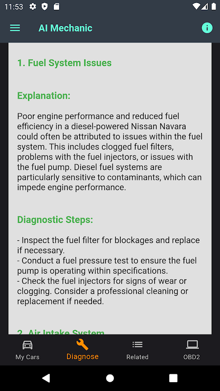 AI سے چلنے والی تشخیص: ہماری AI سے چلنے والی تشخیصی خصوصیت کے ساتھ روایتی OBD2 اسکیننگ سے آگے بڑھیں۔ بس اپنی کار کی علامات کو بیان کریں، اور AI مکینک گاڑیوں کی خرابیوں کی ایک وسیع رینج کی ممکنہ وجوہات اور علامات پیش کرتے ہوئے مسائل کا تجزیہ کرے گا۔
