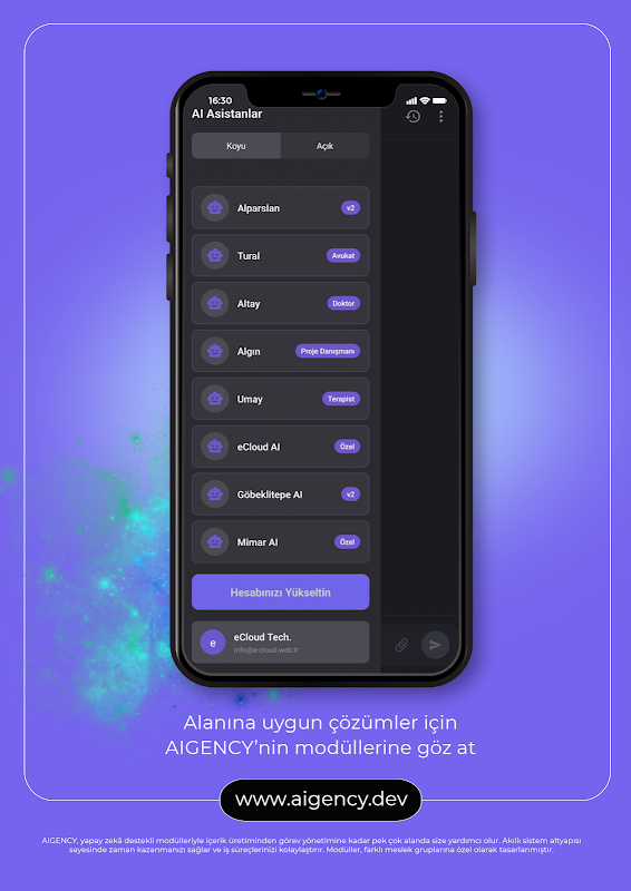 AIGENCY صارفین کی ضروریات کے مطابق اپنی لچکدار ساخت کے ساتھ توجہ مبذول کراتی ہے۔ درخواست کے اندر مختلف مصنوعی ذہانت کے ماڈیولز؛ یہ صحت کے تجزیہ سے لے کر قانونی مشاورت تک، مواد کی تخلیق سے لے کر پروجیکٹ مینجمنٹ تک بہت سے کام انجام دیتا ہے۔ AIGENCY صرف ایک درخواست نہیں ہے۔ یہ ایک ایسا مرکز بھی ہے جو آپ کی ڈیجیٹل زندگی کا انتظام کرے گا۔