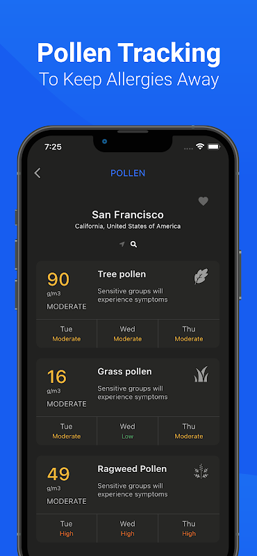 - پولن ٹریکنگ اور پیشن گوئی: امریکہ اور یورپ میں 3 قسم کے پولن (درخت، گھاس اور گھاس کا جرگ) پر عمل کرتے ہوئے الرجی سے بچیں