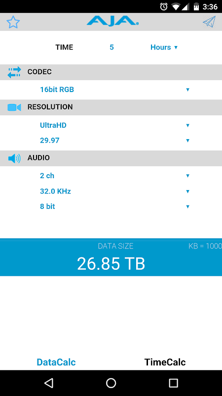The AJA DataCalc computes storage requirements for professional video and audio media.