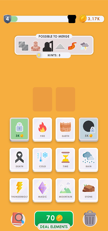سکے حاصل کرنے اور ایک نئے عنصر کو غیر مقفل کرنے کے لیے ایک عنصری کارڈ کو دوسرے پر گھسیٹ کر مجموعے بنائیں۔ ان سکوں کے ساتھ اپنے بورڈ کے لیے نئے بے ترتیب عناصر خریدیں۔