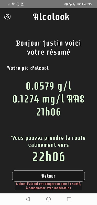 Après avoir indiqué quelques informations ainsi que ses consommations, une estimation du taux d’alcool dans le sang et dans les poumons apparaît en temps réel. De plus, Alcolook permet de connaître l’heure indicative à laquelle la reprise du volant peut se faire en toute sécurité, l'heure à laquelle le taux d'alcoolémie seras le plus élevé. 🍻🥂