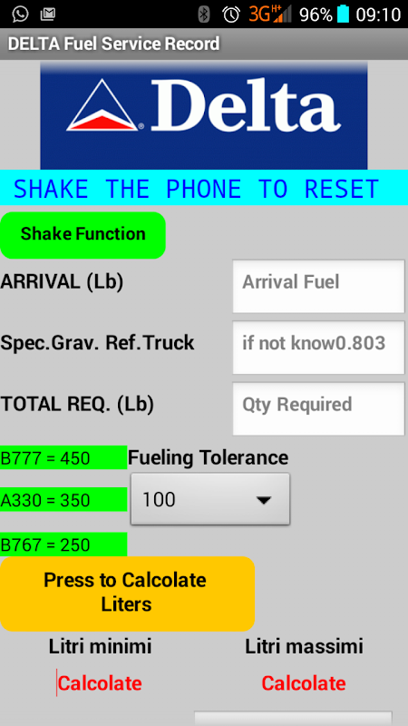 Questa semplice calcolatrice vi aiuterà a gestione e rifornire di carburante sui voli Delta, per rimanere nella tolleranza accettata alla fine del processo. Poi vi aiuterà a riempire il Fuel Service Record.