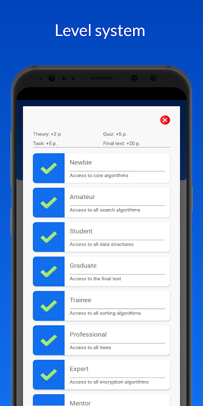 ہر لیکچر کے لیے جو آپ پڑھتے ہیں اور ہر مسئلہ جو آپ حل کرتے ہیں آپ کو پوائنٹس ملتے ہیں جو "الگورتھمز: پروگرامنگ سیکھیں" ایپ میں آپ کی سطح کو بڑھاتے ہیں۔ ہر سطح نئے الگورتھم اور ڈیٹا ڈھانچے تک رسائی کھولتا ہے۔