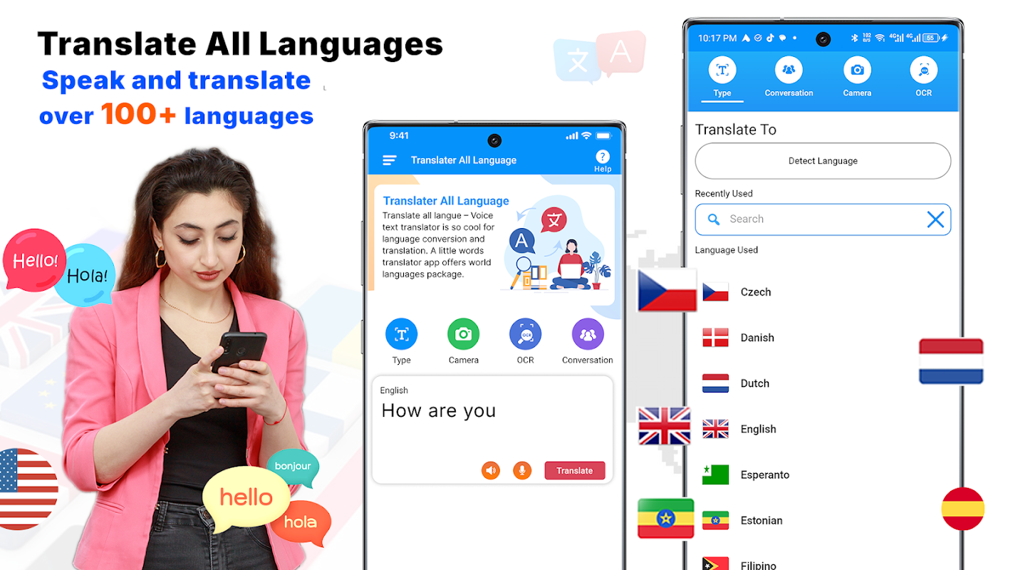 یہاں ایک صوتی مترجم اور انگریزی سے ہسپانوی مترجم قابل رسائی ہے۔ آپ آرٹیفیشل انٹیلی جنس (AI) کو ٹیکسٹ ٹرانسلیٹر کے ساتھ متن کا ترجمہ کرنے کے لیے چیٹ ٹرانسلیٹر اور کیمرہ مترجم کا بھی استعمال کر سکتے ہیں۔ آپ آل لینگویج ٹرانسلیٹر ایپ کی صوتی مترجم کی خصوصیت کا استعمال کر کے متن اور آواز کی شکل میں آڈیو مترجم آسانی سے حاصل کر سکتے ہیں۔ اس ایپ میں آڈیو اور صوتی مترجم کے ساتھ آسانی سے موازنہ کرنے کے لیے، تصویر میں انگریزی سے ہسپانوی مترجم کیمرے کے مترجم کے ساتھ اصل متن کے اوپر براہ راست نظر آئے گا۔