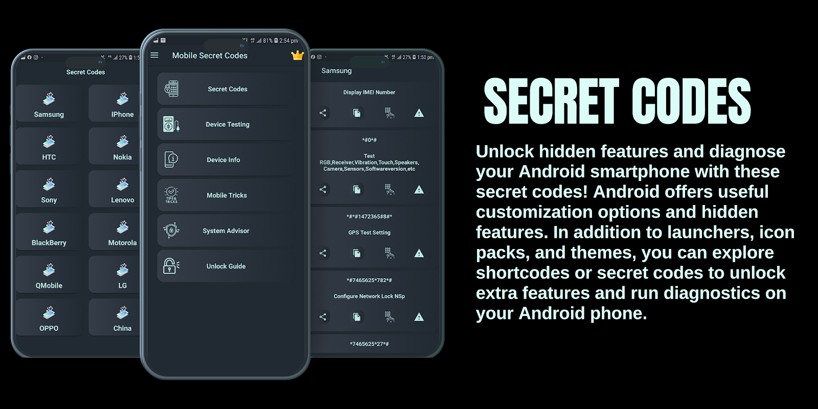 موبائل سیکریٹ کوڈز اور ڈیوائس ٹیسٹنگ میں آپ کے فون کی بہت سی پوشیدہ معلومات اور سیٹنگ دستیاب ہوتی ہے جس تک صرف خفیہ کوڈز ڈائل کرکے رسائی حاصل کی جاسکتی ہے۔ موبائل سیکریٹ کوڈز آپ کے اینڈرائیڈ فون کی تمام پوشیدہ معلومات تک رسائی فراہم کرتے ہیں۔ اس ایپ میں تمام موبائل کمپنیوں اور تمام اینڈرائیڈ موبائلز کے سیکرٹ کوڈز شامل ہیں۔