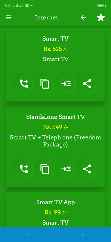 تمام نیٹ ورک پیکجز مکمل تفصیلی معلومات کے ساتھ کالز، ایس ایم ایس، انٹرنیٹ اور دیگر پیکجز فراہم کرتے ہیں۔ اس ایپ میں دستیاب تمام بڑے پاکستانی موبائل نیٹ ورکس جیسے جاز، ٹیلی نار، یوفون اور زونگ کے پیکجز شامل ہیں۔ یہ ایپلیکیشن پی ٹی سی ایل براڈ بینڈ، 3 جی/4 جی ڈیوائسز اور سمارٹ ٹی وی کے بارے میں پیکیج کی معلومات بھی فراہم کرتی ہے۔