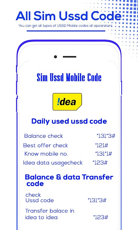 All Network USSD Codes App will help to find out the USSD Mobile Codes for All Mobile operators in India. Also this application can works without internet so you can access all USSD codes even if you are not connected to the internet.
