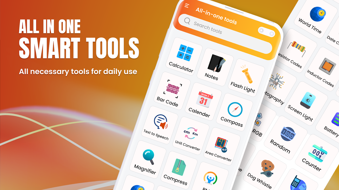 ہمارا سمارٹ ٹول باکس ایک عام "اسٹینڈ لون ٹول" ایپ جیسے کمپاس ٹول، ٹرانسلیٹر ٹول یا رنگ ٹون میکر ٹول ایپ کے سائز کا آدھا ہے۔ اس طرح آپ اپنی ضرورت کے تمام روزمرہ کے لوازمات کی تیزی سے تلاش کریں گے!