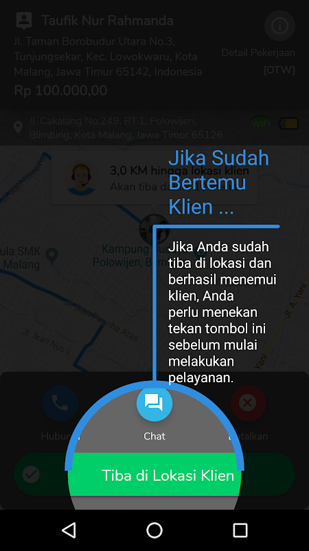 Anda sebagai teknisi dapat menentukan jarak jangkauan Anda terhadap pekerjaan masuk dari klien. Kemudian setelah Anda menerima pekerjaan masuk, Anda harus segera menuju ke lokasi klien untuk mengatasi permasalahan. Pekerjaan dapat ditangani langsung di rumah klien tersebut, atau jika tidak memungkinkan maka dapat Anda bawa ke kantor kami di J-Tech pada jam kerja untuk mendapatkan peralatan yang lebih lengkap dan juga bantuan dari teknisi lainnya.