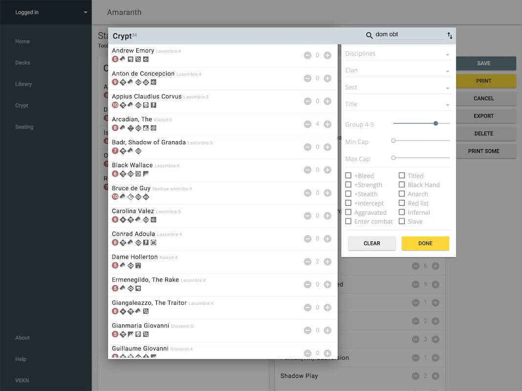 Deck building tool for Vampire the Eternal Struggle (V:TES / VTES)