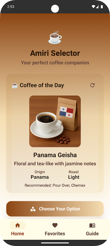 Amiri Selector is your personal coffee guide, helping you choose the ideal cup at any moment. Whether it's morning, afternoon, or evening, the app suggests the perfect brew for your time of day.