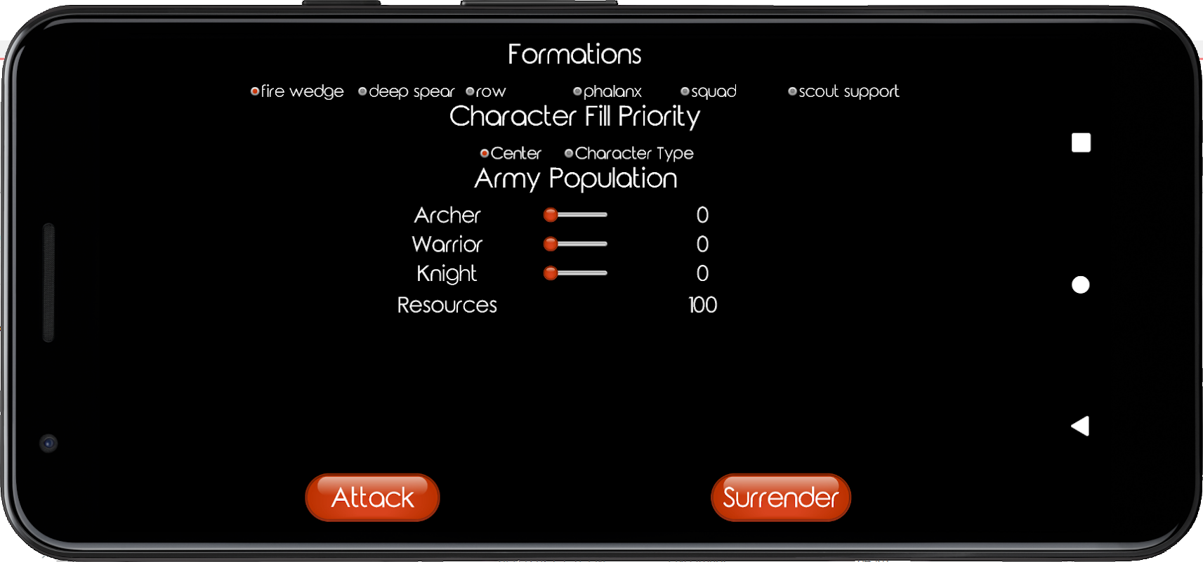 The current implementation allows you to select the types of solders used in your squad, as well as the formation for each battle. Once that is done, the battle will begin.